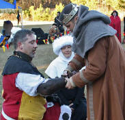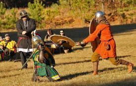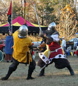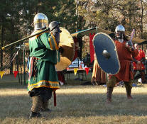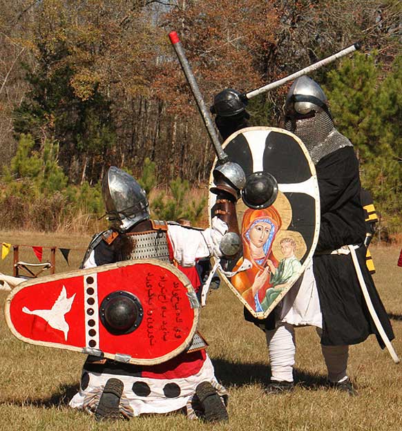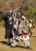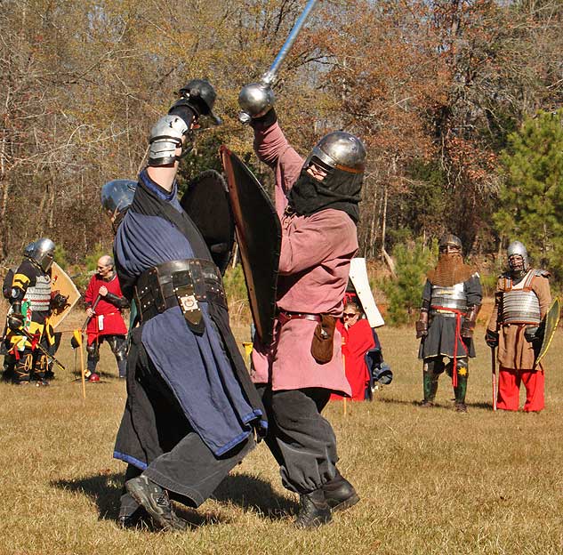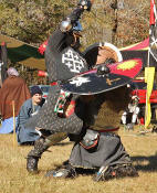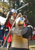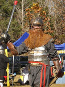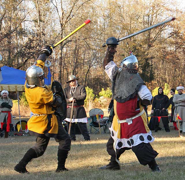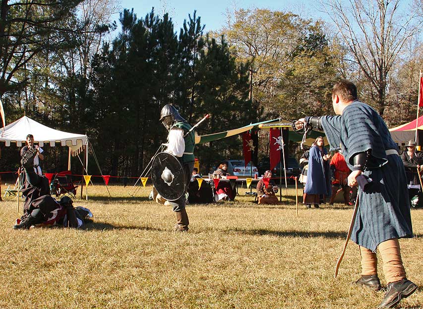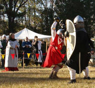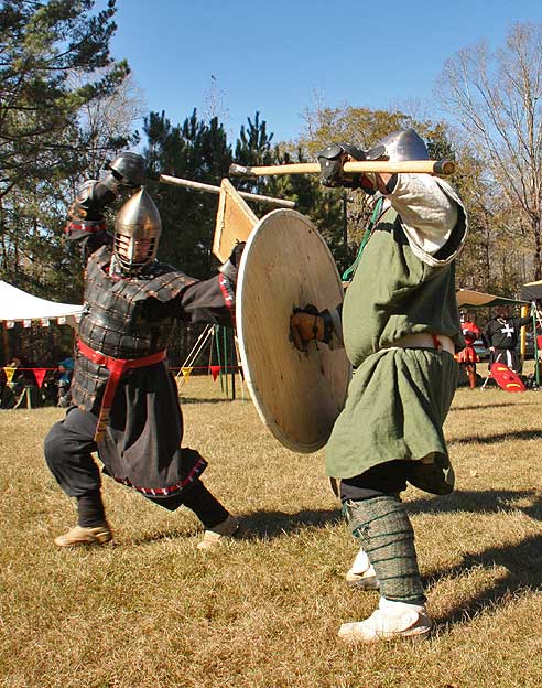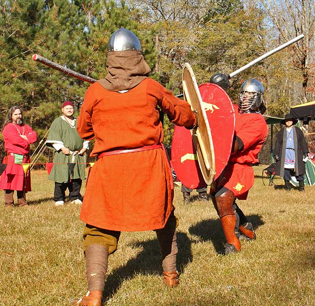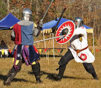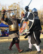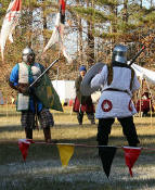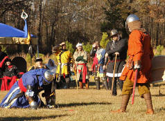 Grimbaldus Bacon becomes Queen's Champion. The Tournament of Champions 16 take the field. Caillin Macleod, Martin von Augsburg, Grimbaldus Bacon, Mikail Al-Rashid (Dex), Brian McBrand and Geoffrey De Bradelei (Dulinn) entered through four Barony sponsored lists. His Majesty William requested that Ashikaga Hiromoto fill his Tourney slot, then tagged Bart Hightower to fill the 16th slot, left vacant by Rey Ribeaumont. Prince Jon passed his Royal Consorts, Ladies of the Rose & Diamond, slot to Wernherus Rudemann, who placed second. Other peerage champions were Michael of the Mace -Pelicans, Ali al-Badawi al-Maghribi -Chivalry and Havordh AEtterbini -Laurels. Olaf, Strazhek, James & Settimio joined the list. The finals were between two knights of Gleann Abhann, James the Holy and Ashikaga Hiromoto. Ashi claimed victory and was honored with his lady Ashikaga Kimiko.